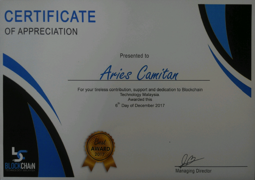 Presented to Aries Camitan, For your tireless contribution, support and dedication to Blockchain Technology Malaysia. Awarded this 6th Day of December 2017.