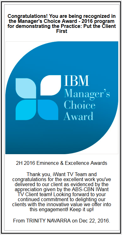 2H 2016 Eminence & Excellence Awards. Thank you, iWant TV Team and congratulations for the excellent work you've delivered to our client as evidenced by the appreciation given by the ABS-CBN IWant TV Client team! Looking forward to your continued commitment to delighting our clients with the innovative value we offer into this engagement! Keep it up!